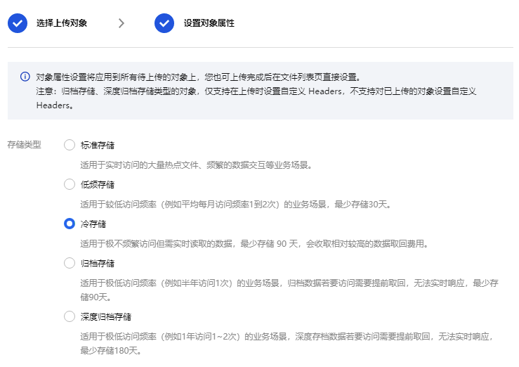 1.4 Select local files to upload, and set the storage type to COLD in the object properties.