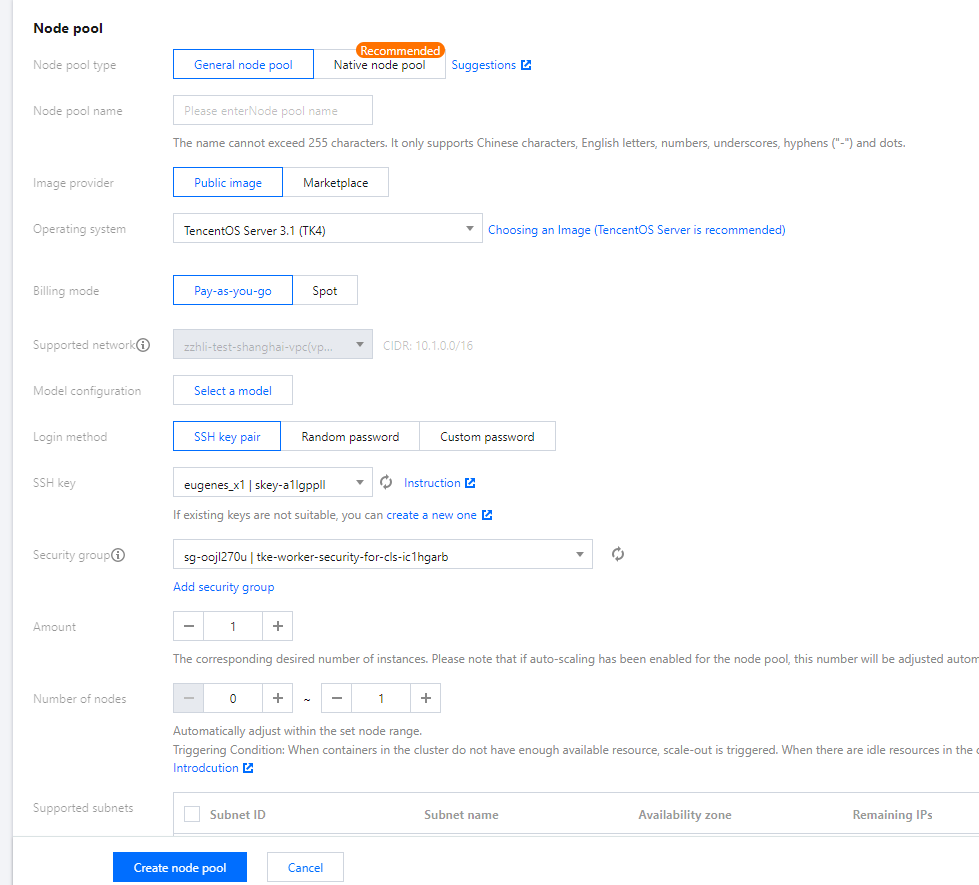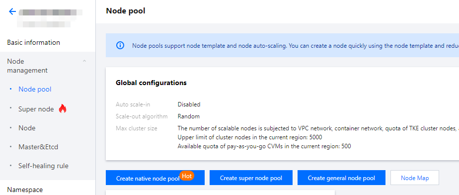 3. Click Node management > Node pool in the left sidebar to go to the node pool list page. 4. Click Create node pool to go to the Node pool page, and set parameters as instructed. Node pool name: Enter a custom pool name.