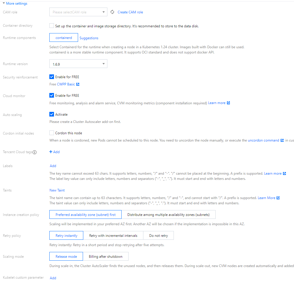 (Optional) Click More Settings to view or configure more information. CAM role: You can bind all the nodes of the node pool to the same CAM role, and grant the authorization policy bound to the role to the nodes. For more information, see Managing Roles. Container directory: Select this option to set up the container and image storage directory. We recommend that you store to the data disk, such as /var/lib/docker.