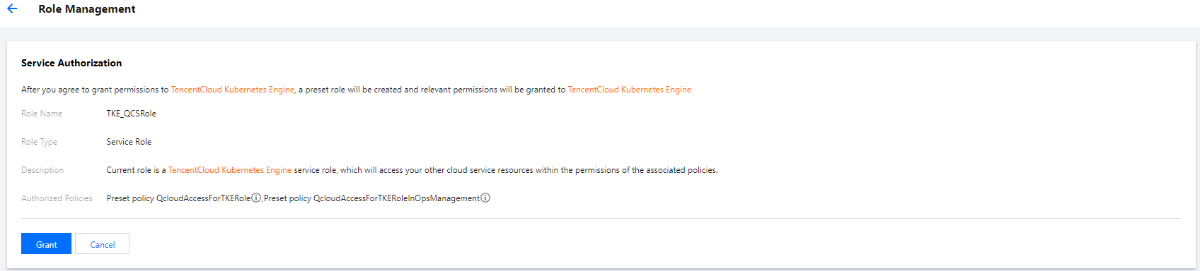 TKE_QCSRole and IPAMDofTKE_QCSRole. This document introduces the details of each authorization policy, and the authorization scenarios and authorization steps for each role.TKE_QCSRole, which is associated with multiple preset policies by default. To obtain relevant permissions, you need to perform the corresponding preset policy authorization operations in specific authorization scenarios. After these operations are completed, the corresponding policy will appear in the role's list of authorized policies. The preset policies associated with TKE_QCSRole by default include:QcloudAccessForTKERole: The permission for TKE to access cloud resources.QcloudAccessForTKERoleInOpsManagement: The permission for Ops management, including the log service.QcloudAccessForTKERoleInCreatingCFSStorageclass: The permission for TKE to operate on Cloud File Storage (CFS), including adding/deleting/querying CFS systems, and querying the mount targets of a file system.QcloudCVMFinanceAccess: CVM finance permission