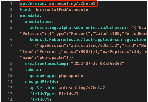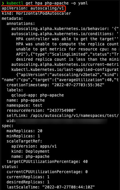 kubectl get horizontalpodautoscaler.v2beta2.autoscaling php-apache -o yaml# kubectl edit horizontalpodautoscaler.v2beta2.autoscaling php-apache