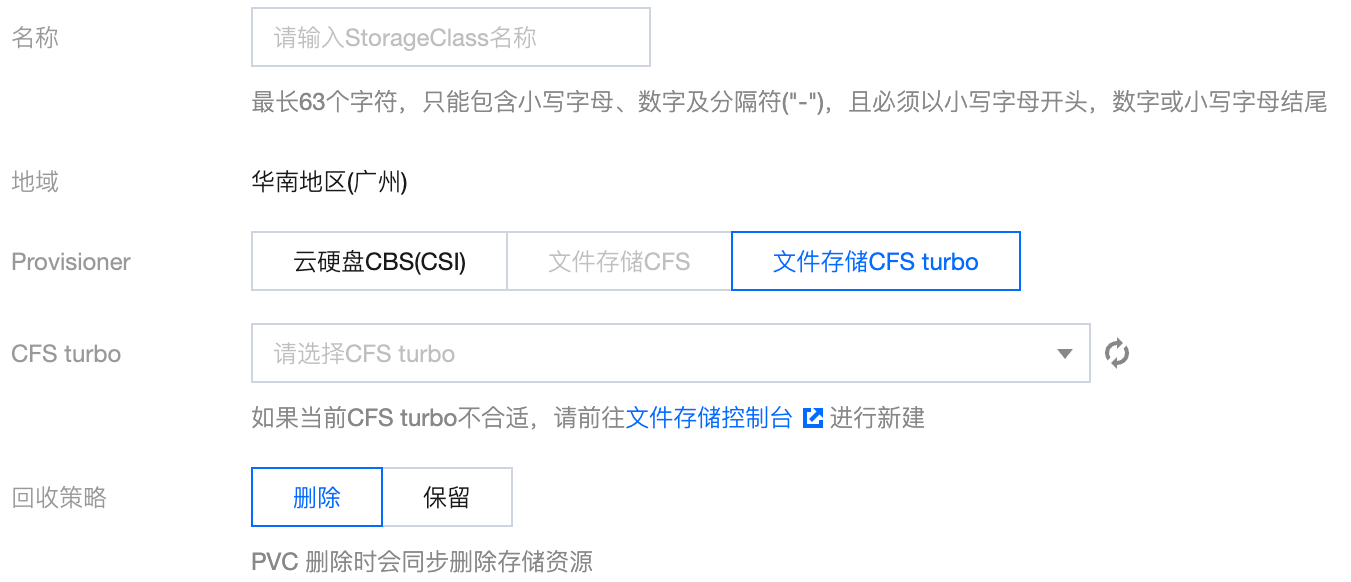 Provisioner | 选择文件存储 CFS Turbo。 |