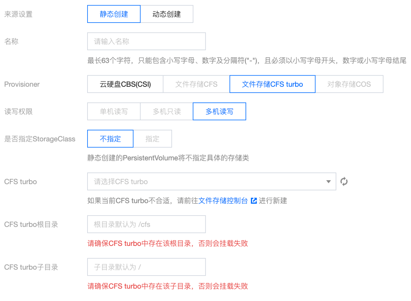 Provisioner | 此处选择文件存储 CFS Turbo。 |
