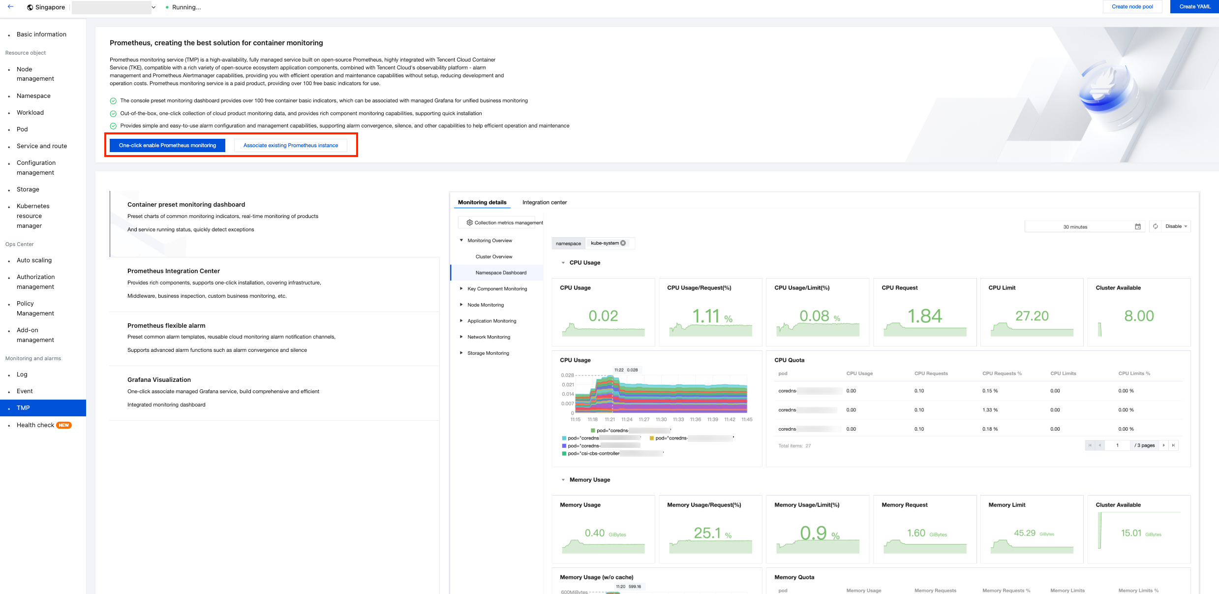 4. Enable TMP through one-click enable Prometheus monitoring or associating an existing TMP instance.