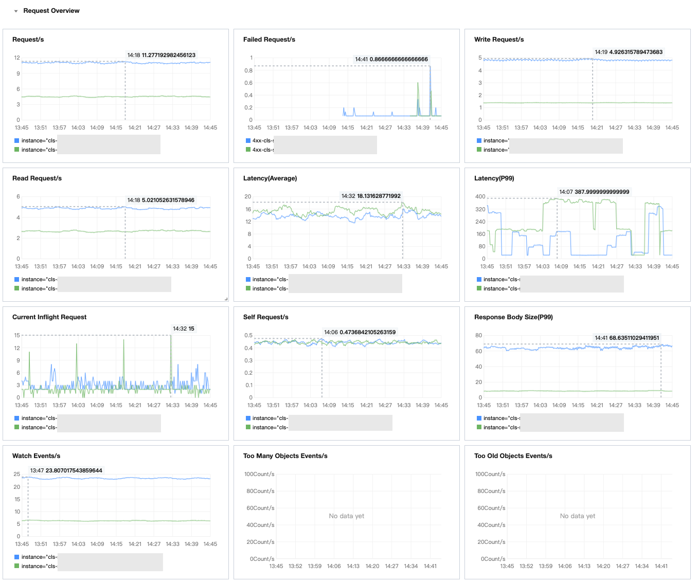 Request overview | apiserver_current_inflight_requests | Gauge | Number of requests currently being processed by API Server. Requests are classified into the following types: ReadOnly: Such requests will not change the cluster status. They are typically operations for accessing resources, such as obtaining the Pod list and querying the node status. Mutating: Such requests will change the cluster status. They are typically operations for creating, updating, or deleting resources, such as creating a Pod and updating Service configurations. |
