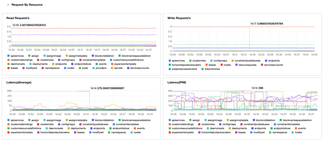 Latency(P99) | API Server request P99 latency | apiserver_request_duration_seconds_bucket | API Server request P99 latency (classified by resource). Unit: ms. |