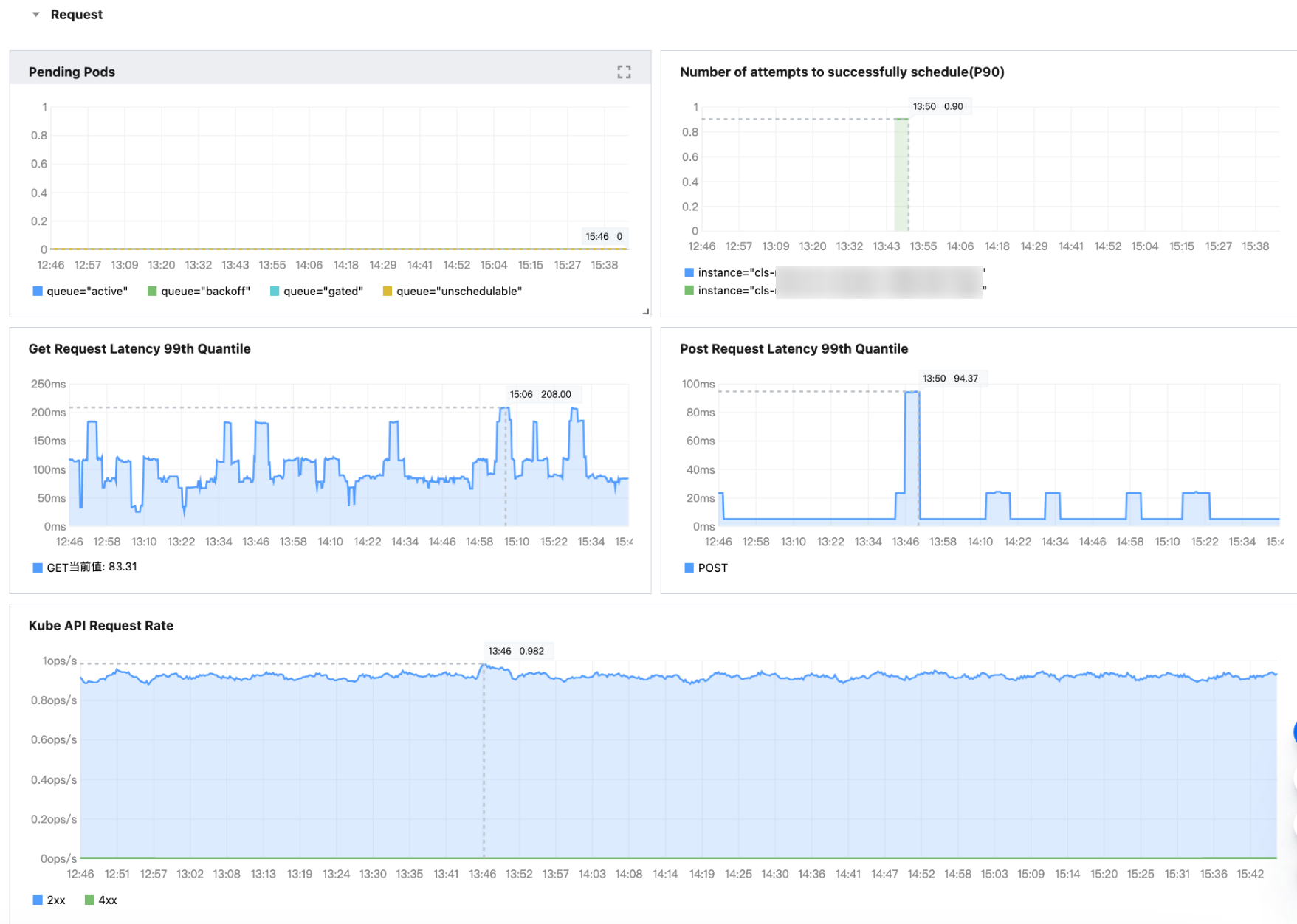 请求分析 | scheduler_pod_scheduling_attempts_bucket | Histogram | 调度器在尝试将 Pod 调度到节点时的调度尝试次数。 bucket 阈值为{1、2、4、8、16}。 |