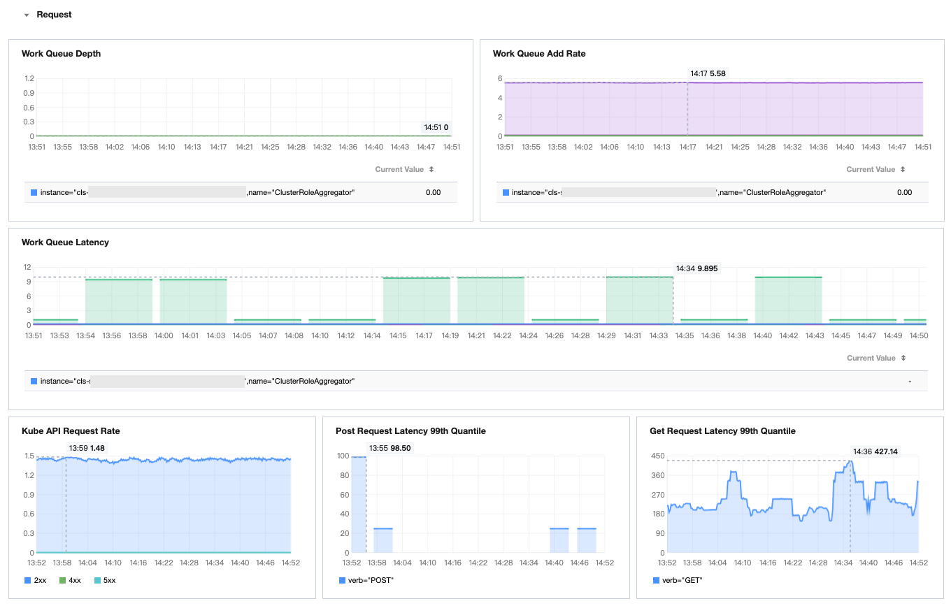 Request analysis | workqueue_depth | Gauge | Current depth of the workqueue. If the queue depth remains high for a long time, it indicates that the Controller cannot process tasks in the queue in time, causing a backlog of tasks. |