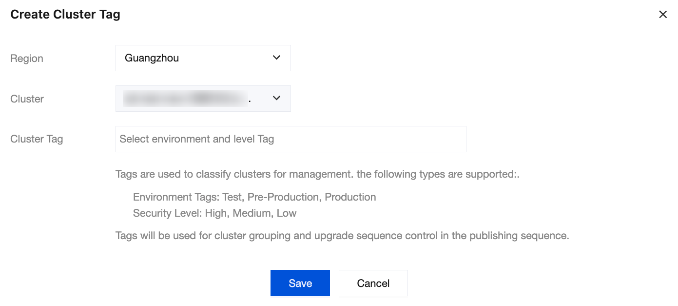 Cluster Tag: Select the environment type and protection level of the cluster.