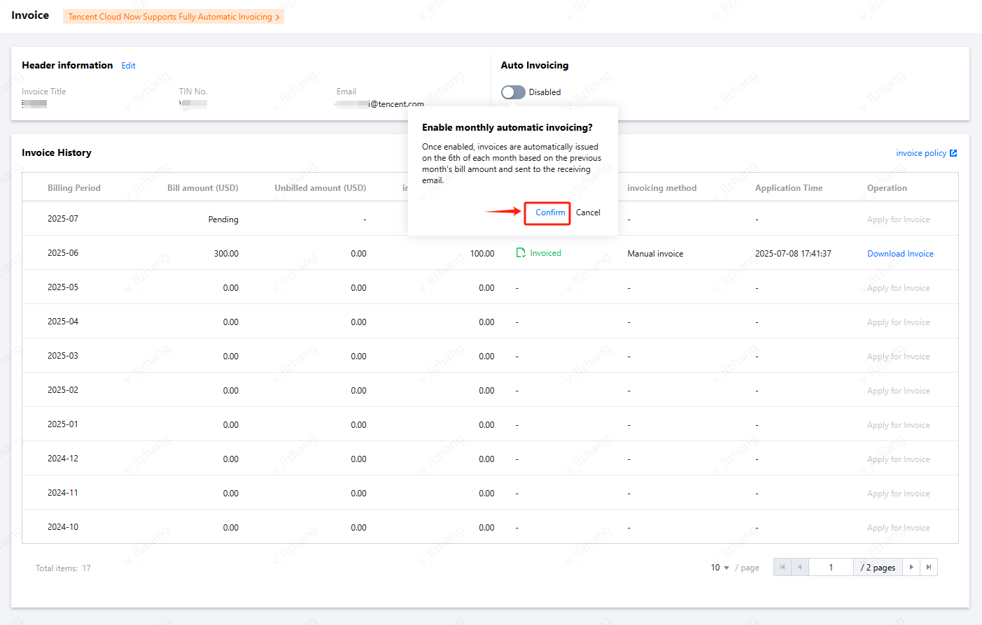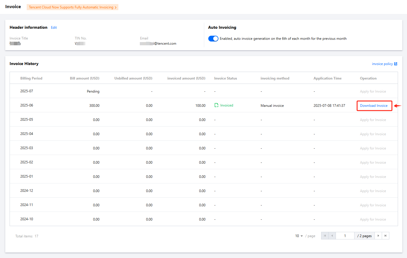 Bills from January 2024 to this day can be selected by the corresponding billing month on the invoice record page via Console. Click Apply for Invoicing. After invoicing is successful, the invoice will be sent to the receiving email you have set. You can download it directly from your mailbox or log in to the Billing Console to query and download the invoice. How to Modify the Receiving Email for Invoices