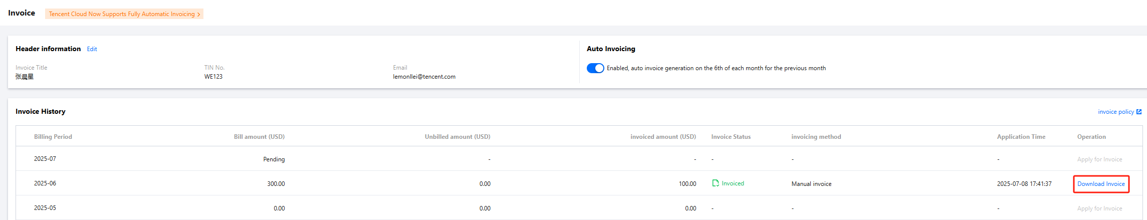 Real-name authentication: Please first complete account real-name authentication before applying for invoicing. Go to verify identity. Invoice Title: Set the receiving email, tax number, and related information via the Expense Center > Billing Statement > Invoice > Header Information > Edit feature in the Console. Note: