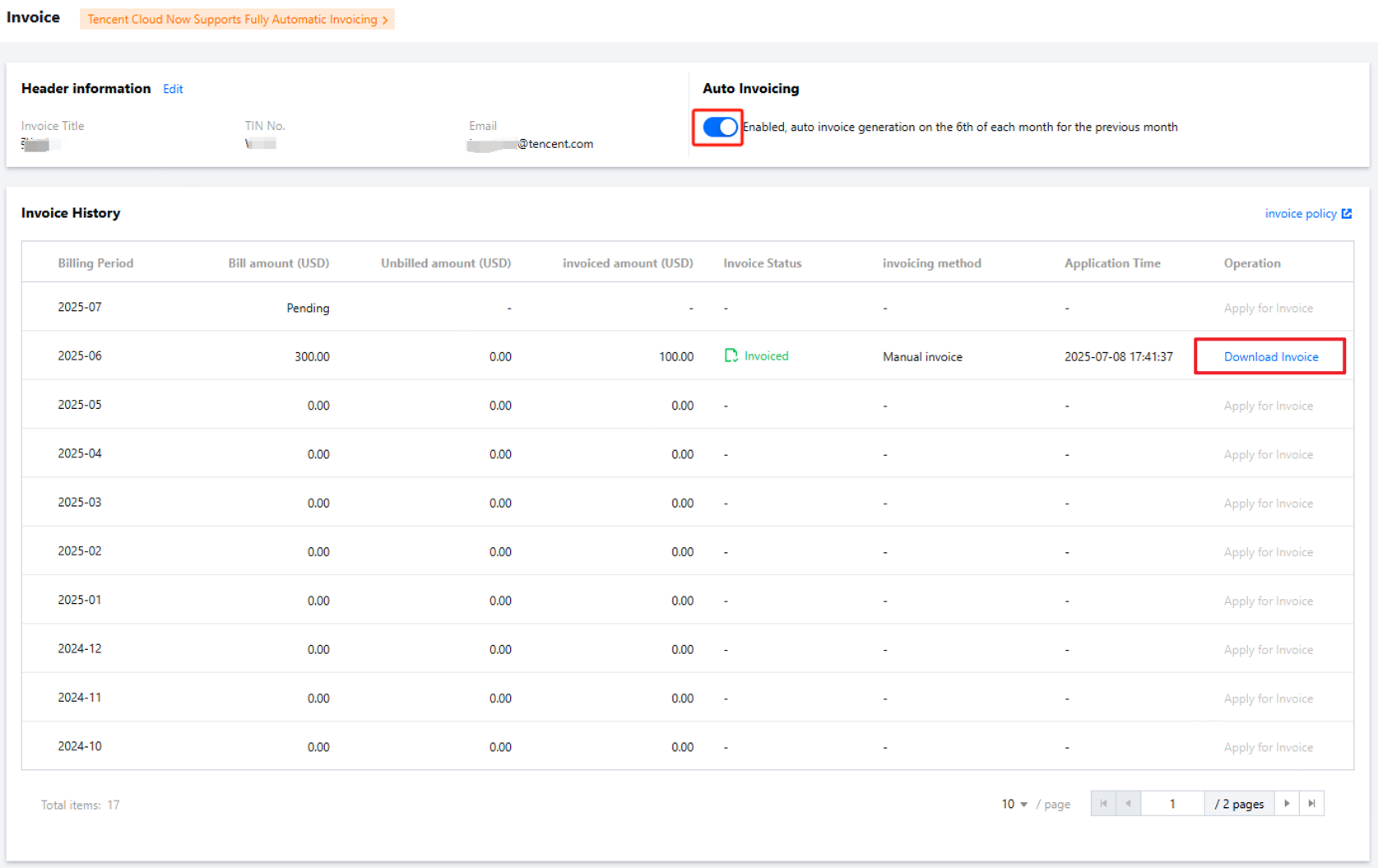 After purchasing International Site Products, you can apply for an invoice through the Tencent Cloud self-service invoicing system.