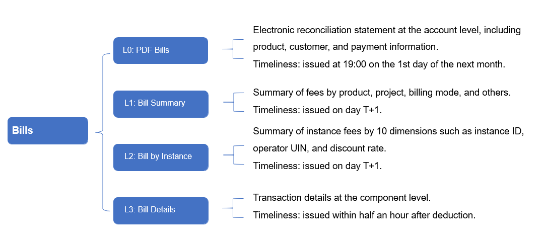 Bills reflect your monthly expenditure and resource details in Tencent Cloud, providing a proof of reconciliation for you. They are divided into the following four levels:
