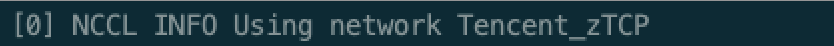 -np and -H parameters. Other parameters are as detailed below:NCCL_ALGO=RING: Select the ring algorithm as the communication algorithm in NCCL.NCCL_DEBUG=INFO: Enable debugging output in NCCL.-mca btl_tcp_if_include eth0: Select the eth0 device as network device for MPI multi-server communication. As some ENIs cannot communicate, you need to specify the ENI if there are multiple ones; otherwise, an error will occur if MPI chooses an ENI that cannot communicate.Model: CVM GT4.41XLARGE948 (A100 * 8 + 50G VPC) GPU driver: 460.27.04 Container: ccr.ccs.tencentyun.com/qcloud/taco-training:cu112-cudnn81-py3-0.3.2 | ||