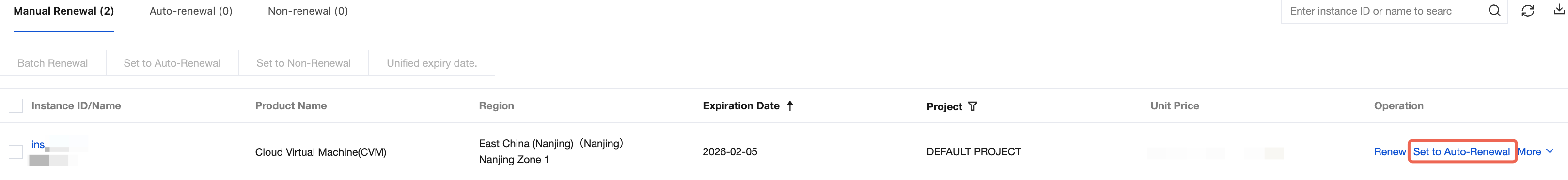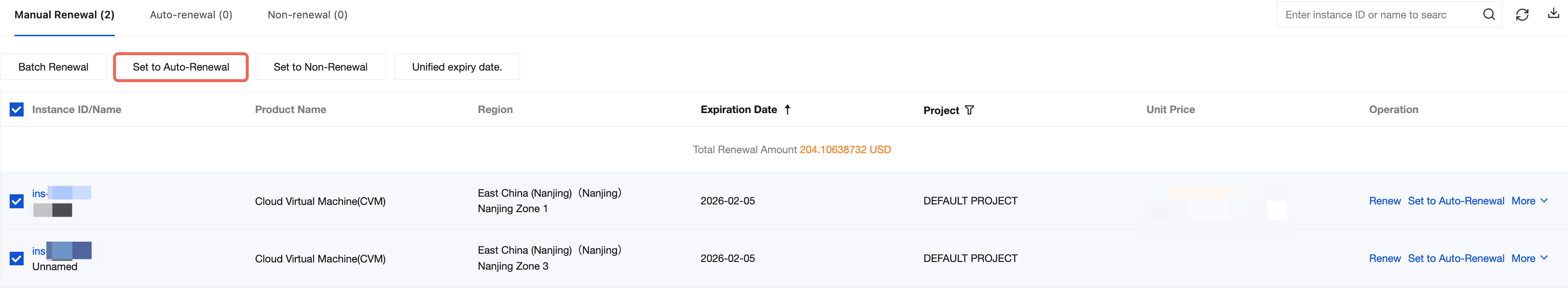1. Select all yearly/monthly subscription instances that require auto-renewal, and click Set to Auto-Renewal at the top, as shown below: