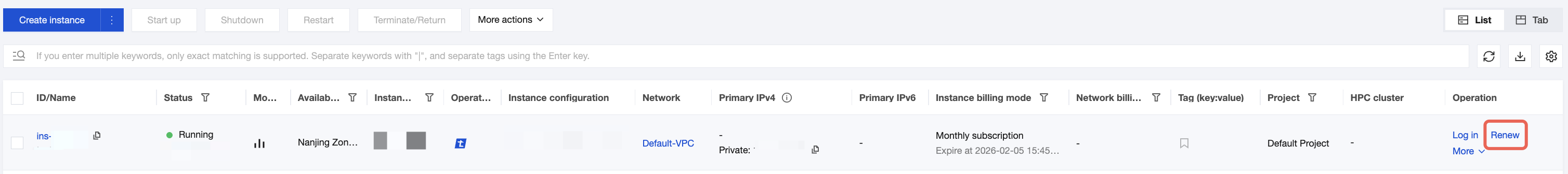 For yearly/monthly Subscription instances: You can renew them directly in the Console. Alternatively, you can visit the Renewal Management to configure auto-renewal or align renewal dates. For pay-as-you-go instances: Simply ensure your account balance is sufficient for automatic renewal. For top-up instructions, see Payment Methods. You can also refer to Balance Notifications to set up alerts and prevent instance termination. This document introduces the renewal of yearly/monthly subscription instances and guides you on performing manual renewal or setting up automatic renewal for yearly/monthly subscription instances.
