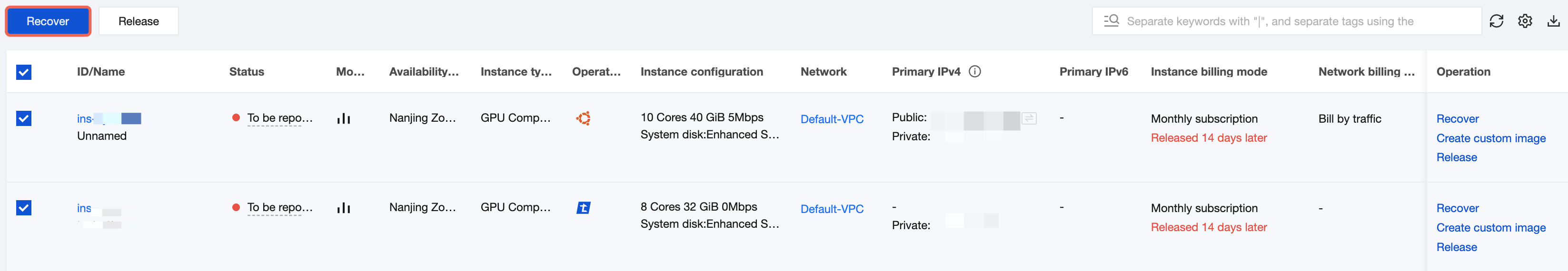 a. Select all instances that need renewal and click Recover at the top, as shown below: