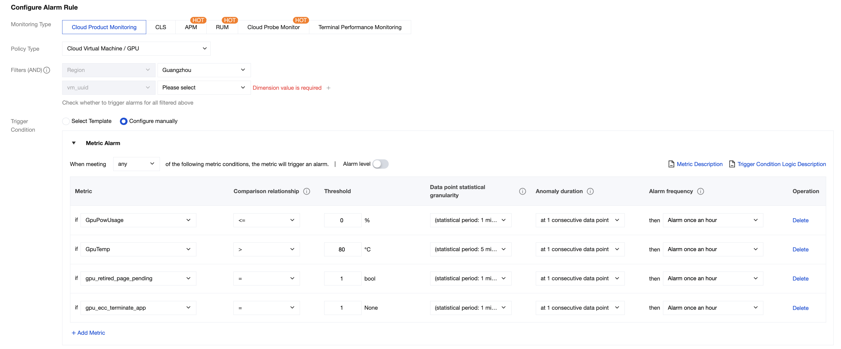 gpu_retired_page_pending | = 1 | Pre-Ampere architecture GPUs experienced an ECC ERROR, application processes were killed, and the GPU card is in a pending state. | Run the nvidia-smi -i <target gpu> -q -d PAGE_RETIREMENT command to check if any GPU card is in a pending state. Reset the GPU card or restart the instance to recover. If restarting does not resolve the issue, Submit a Ticket to contact Tencent Cloud support. |