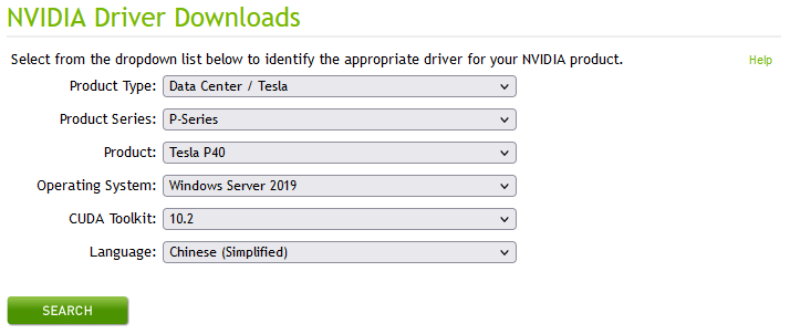 2. Visit the NVIDIA website in a browser and select the GPU driver version. The configuration selected in this article is shown in the figure below: