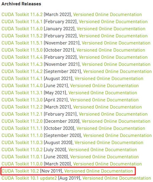 1. Go to CUDA Toolkit Archive and select the required version. This article uses CUDA 10.2 as an example: