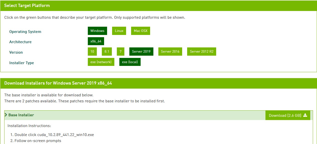 2. Go to the CUDA Toolkit 10.2 Download page and select the corresponding system configuration. The configuration selected in this article is shown in the figure below: