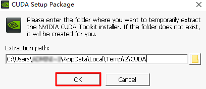 In the pop-up CUDA Setup Package window, the Extraction path is a temporary storage location. No modification is required; leave it as default and click OK, as shown below: