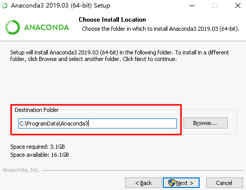 In the Choose Install Location, change the default installation path. The default location uses the hidden ProgramData folder on drive C. For easier management, it is recommended to install Anaconda in another folder. The default path is shown below: