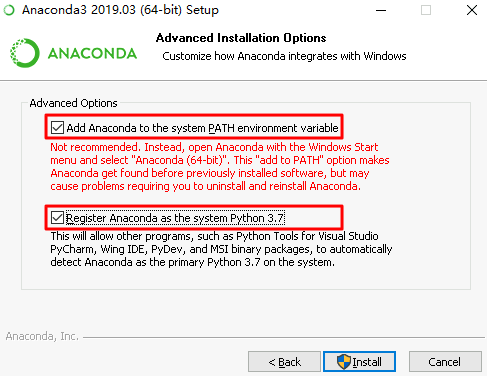 In the Advanced Installation Options, select all options to add Anaconda to environment variables and set Python 3.7 as the interpreter: