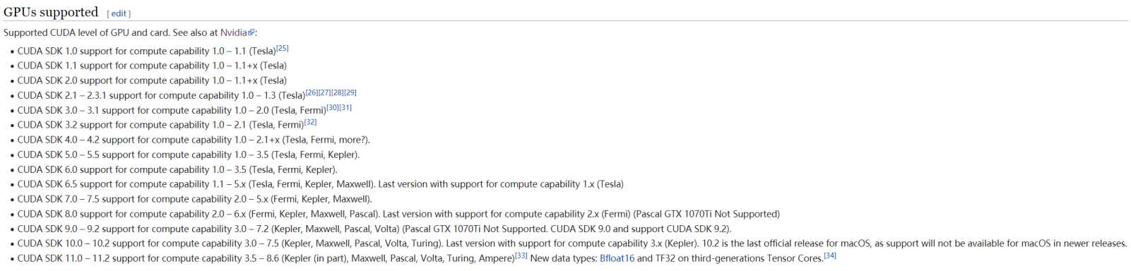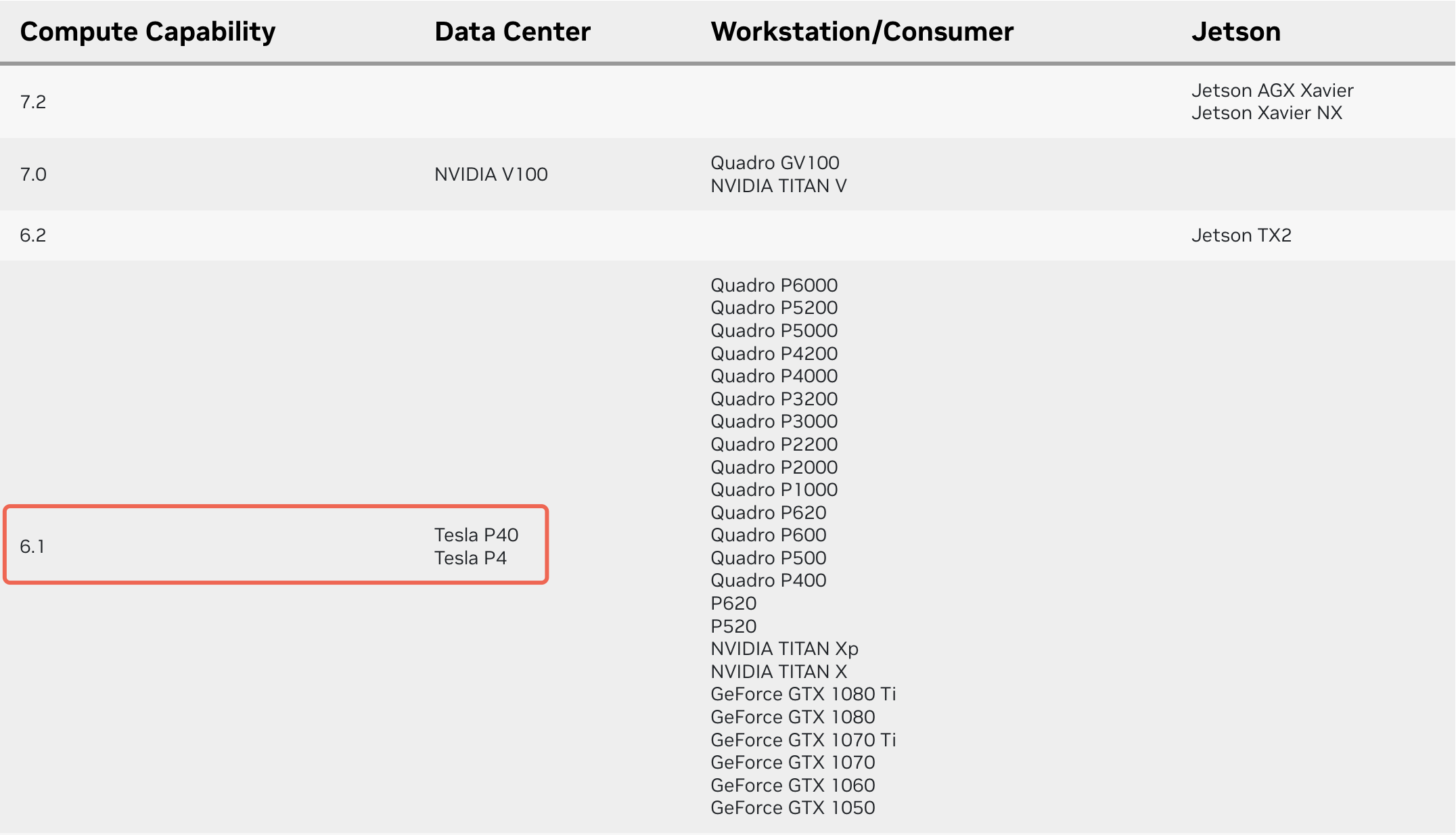 Before selecting the CUDA driver version, you should first confirm the compute capability of the GPU used in this article (Tesla P40). According to NVIDIA’s official website, the Tesla P40 has a compute capability of 6.1, as shown in the figure below: 2. Select the CUDA version.