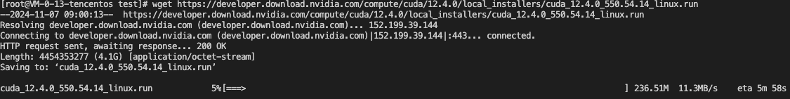 5. Run the wget command to download the installer using the URL copied in Step 4, as shown in the following figure. Alternatively, you can download the CUDA installation package locally and then upload it to the GPU instance server. After downloading or uploading, use ll to view the files in the current directory.