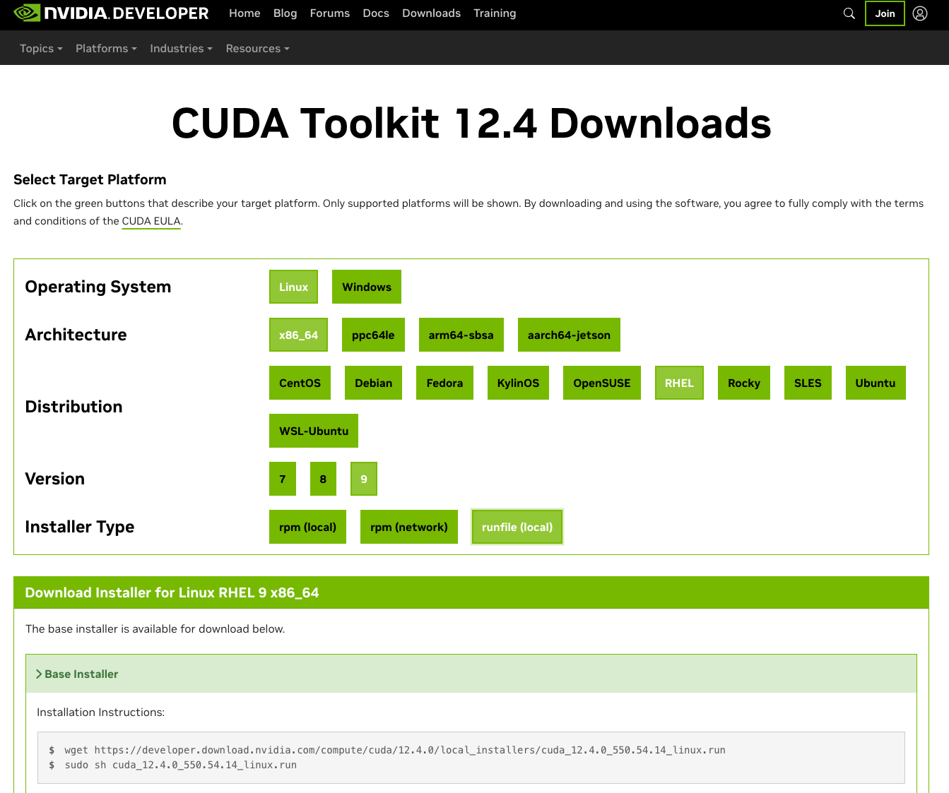 1. Go to the CUDA Toolkit download page or visit https://developer.nvidia.com/cuda-toolkit-archive. 2. Select the CUDA version corresponding to the GPU driver. This document takes CUDA Toolkit 12.4.0 as an example, as shown below: 3. Follow the prompts
