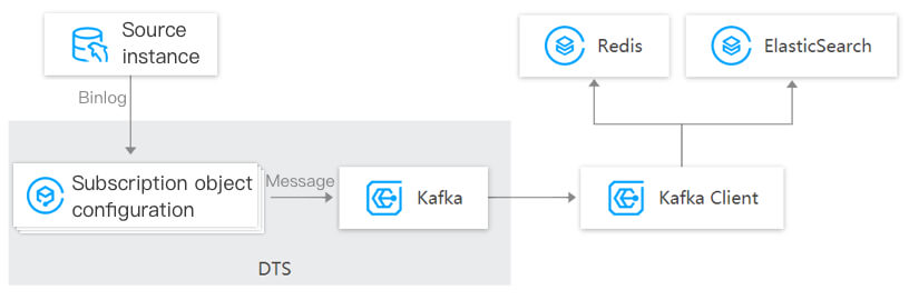 The following takes MySQL as an example to describe how data subscription pulls the incremental binlog from the source database in real time, parses the incremental data into Kafka messages, and then stores them on the Kafka server. You can consume the data through a Kafka client. As an open-source messaging middleware, Kafka supports multi-channel data consumption and SDKs for multiple programming languages to reduce your use costs.