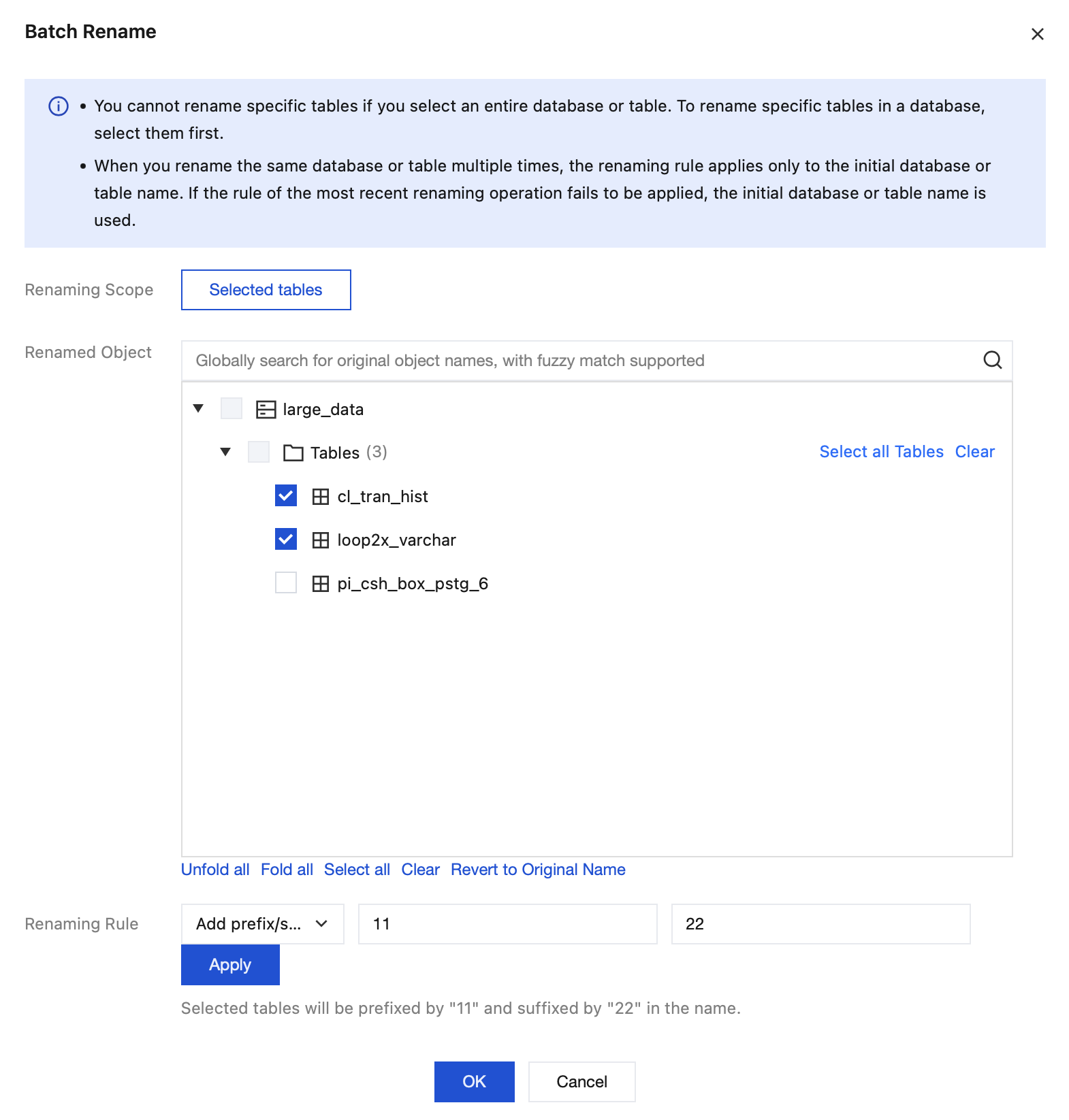 You can either rename a single database/table or rename them in batches. In batch renaming scenarios, there are three renaming methods: adding prefix/suffix, renaming uniformly, and replacing keyword.