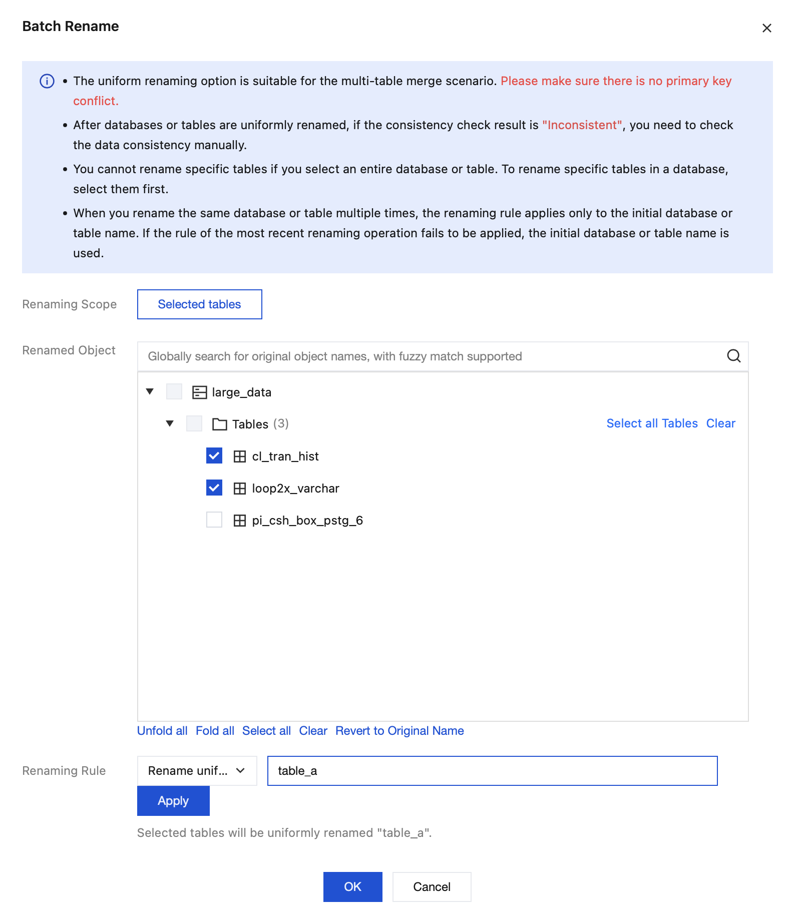 Rename uniformly: The selected objects will be renamed uniformly, which is suitable for multi-table merge scenarios. Make sure that there is no primary key conflict when migrating table data from multiple sources to the target database.
