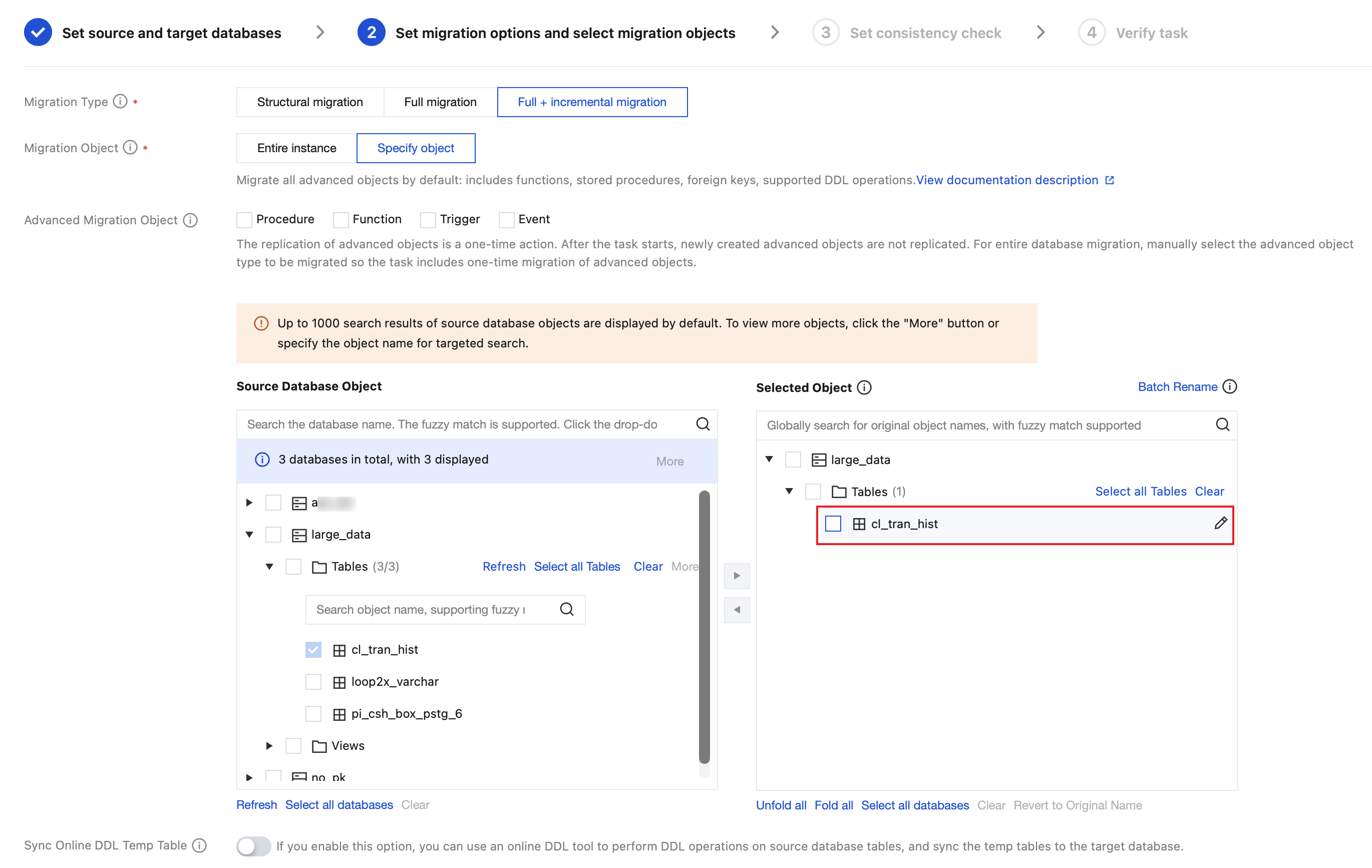 1. If you select an entire database or table as the migration object, you cannot rename a specified table. If you need to do so, select the target tables one by one when selecting migration objects.