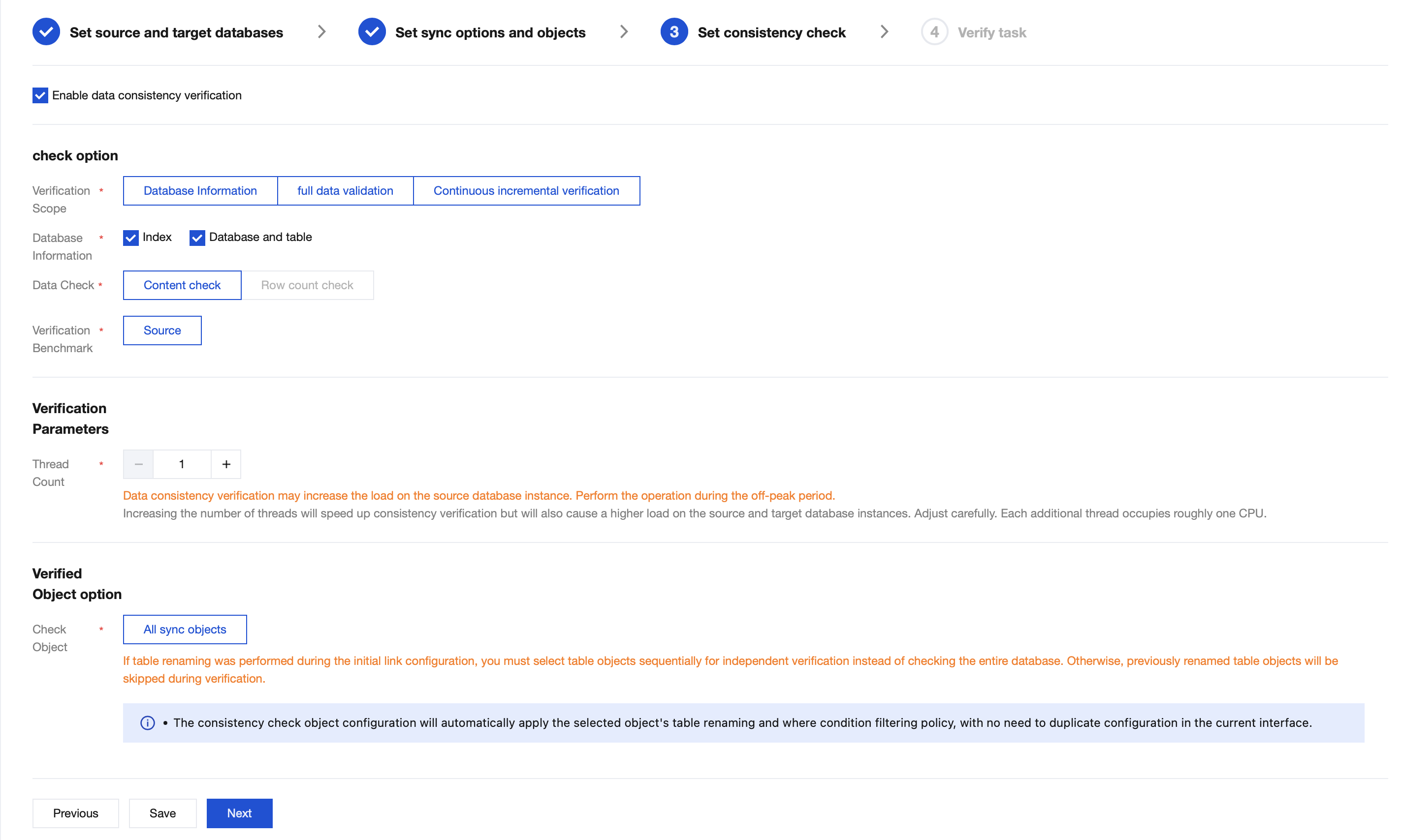 Check Parameter Configuration | Thread Number Selection | The value range is 1–8. Select an appropriate value according to the actual situation. Increasing the number of threads can accelerate the consistency check speed, but it will also increase the load on the source and target databases. |