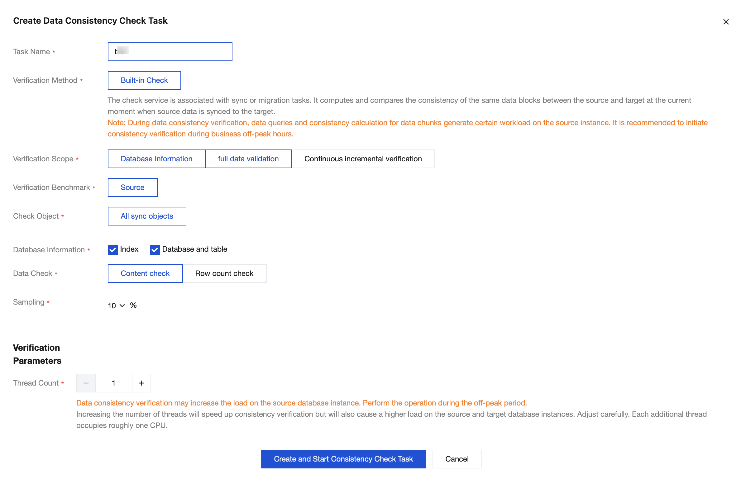 Thread Number Selection | The value range is 1–8. Select an appropriate value according to the actual situation. Increasing the number of threads can accelerate the consistency check speed, but it will also increase the load on the source and target databases. |