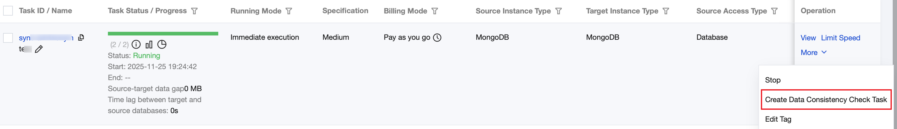 Check Content | Database information: Check indexes, database and table information, and shard keys in the source and target databases. When both the source and target databases are sharded clusters, it is supported to select shard keys for checking. Full data validation: Compare all data in the target database before it is fully synchronized with the source database. Continuous incremental verification: Compare the incremental data generated after the initiation of the continuous incremental check task. |
