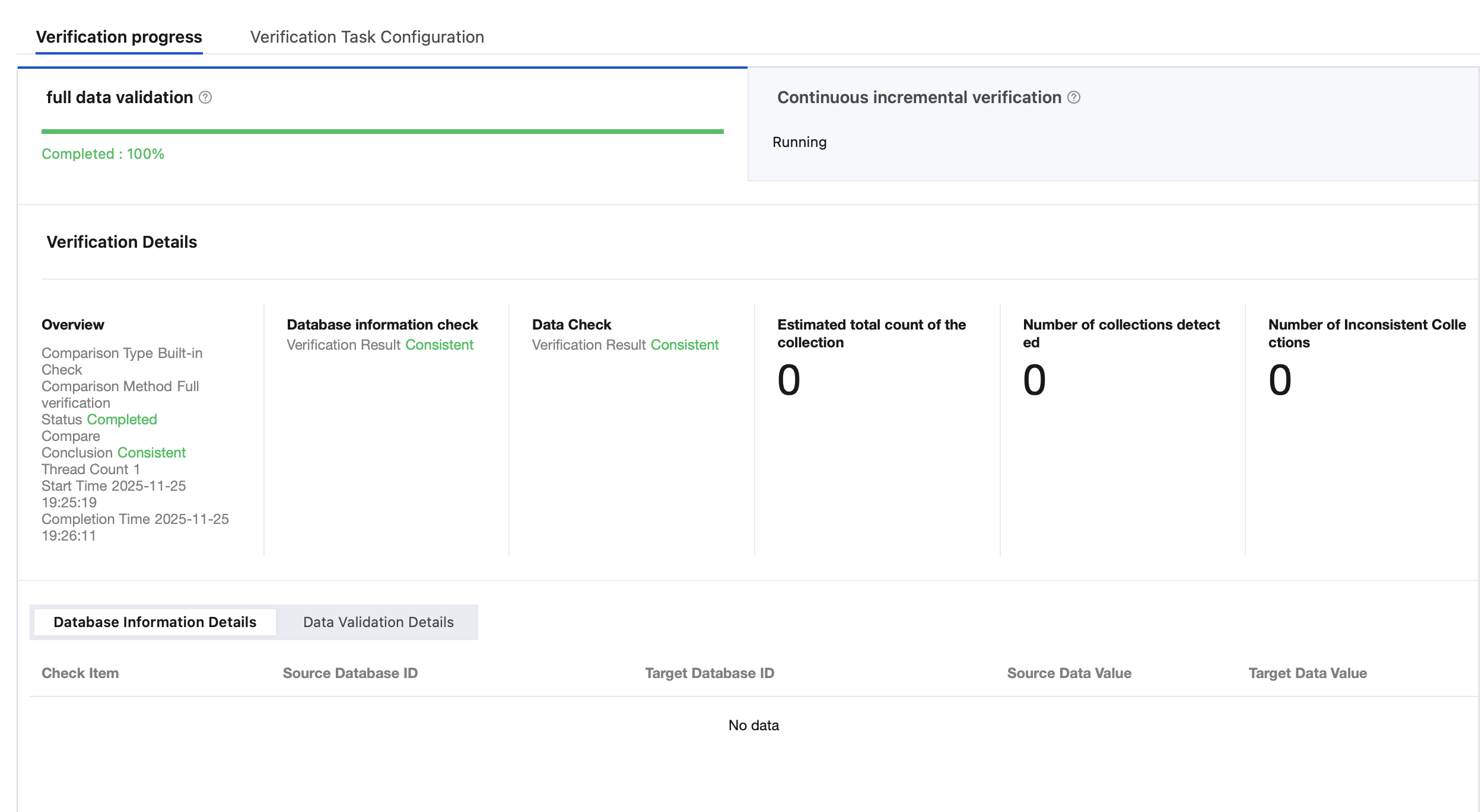 Database information check | Check result: result of the current database information check, which can be inconsistent or consistent. |