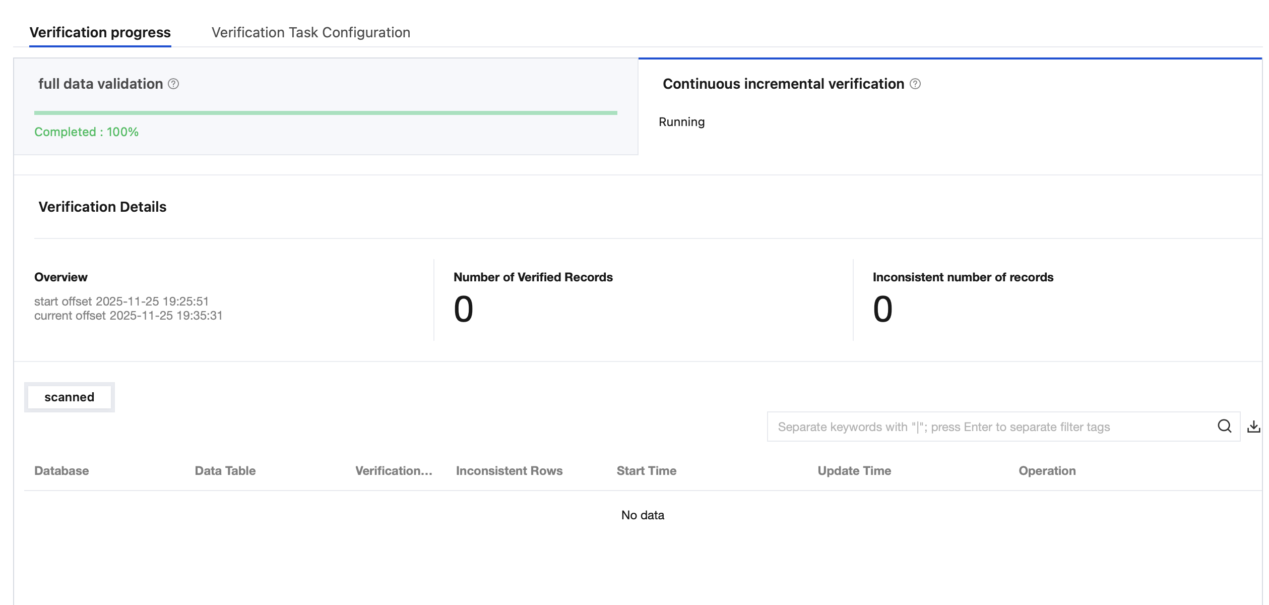 Chek Method | Built-in check: The consistency check service is integrated within the DTS task and is required to be initiated while the task is running. The check cannot be initiated once the DTS task stops running. |