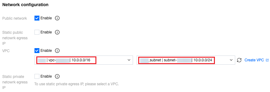 4. Enable VPC and select the VPC to be accessed and the subnet you want to use.
