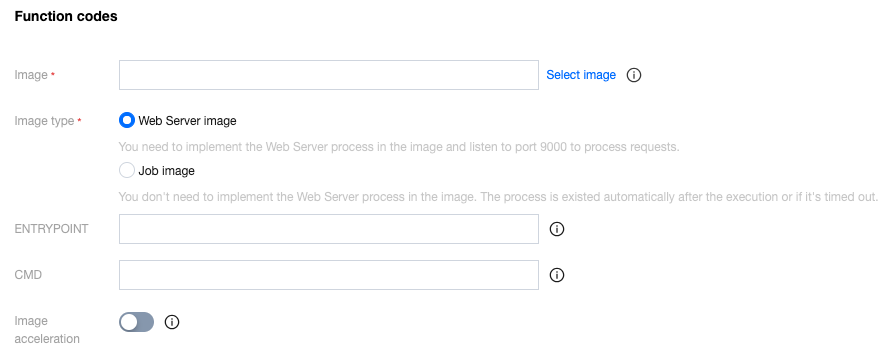 Web Server image: The mirror needs to include an Http Server and listen on port 9000. After the instance is pulled up, the event body is imported into the instance in the form of an HTTP request. Job image: The mirror does not need to include an Http Server and does not expose any ports. After the instance is pulled up, a specific command will be executed according to the CMD and EntryPoint specified by the user. After execution, the instance will be automatically released. The event body is injected into the instance in the form of an environment variable. ENTRYPOINT: (Optional) Set the startup command of the container. Enter an executable command (such as python). If it's left blank, the Entrypoint in the Dockerfile is used.