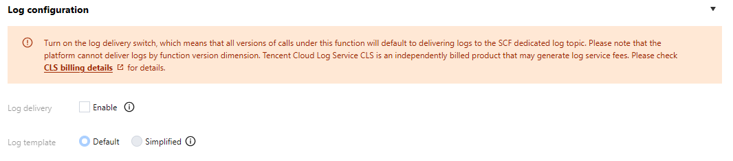 7. Log delivery is disabled by default. After it is enabled, the execution logs of the function can be delivered to the specified location in real time. For more information, see Log Delivery Configuration. Note: