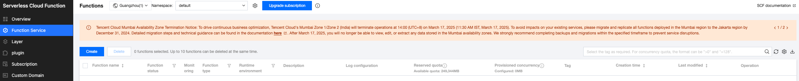 1. Log in to the SCF console and click Function Service on the left sidebar. 2. Select the region and namespace where to create a function at the top of the Functions page and click Create to enter the function creation process as shown below: