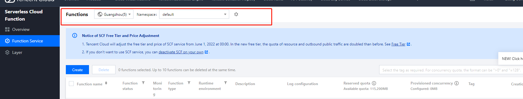 1. Log in to the SCF console and select Function Service on the left sidebar. 2. Select the region and namespace for which to view functions at the top of the Functions page. In the function list, you can view all the functions in the specified region and namespace as shown below: