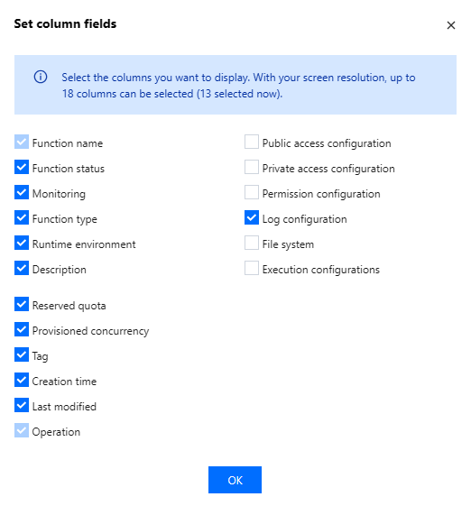 3. The function list displays the function name, monitoring information, function type, runtime environment, log configuration, and creation time. You can customize the displayed fields as needed by clicking on the right as shown below: 4. In the pop-up window, select the fields you want to display and click OK as shown below: