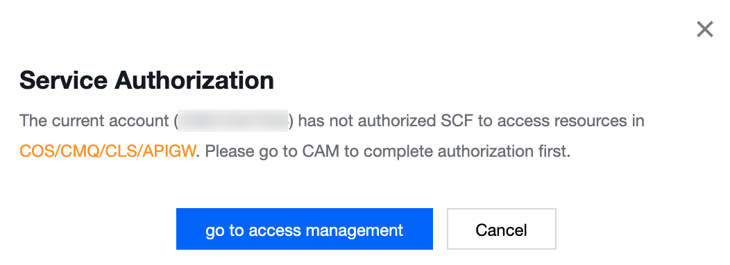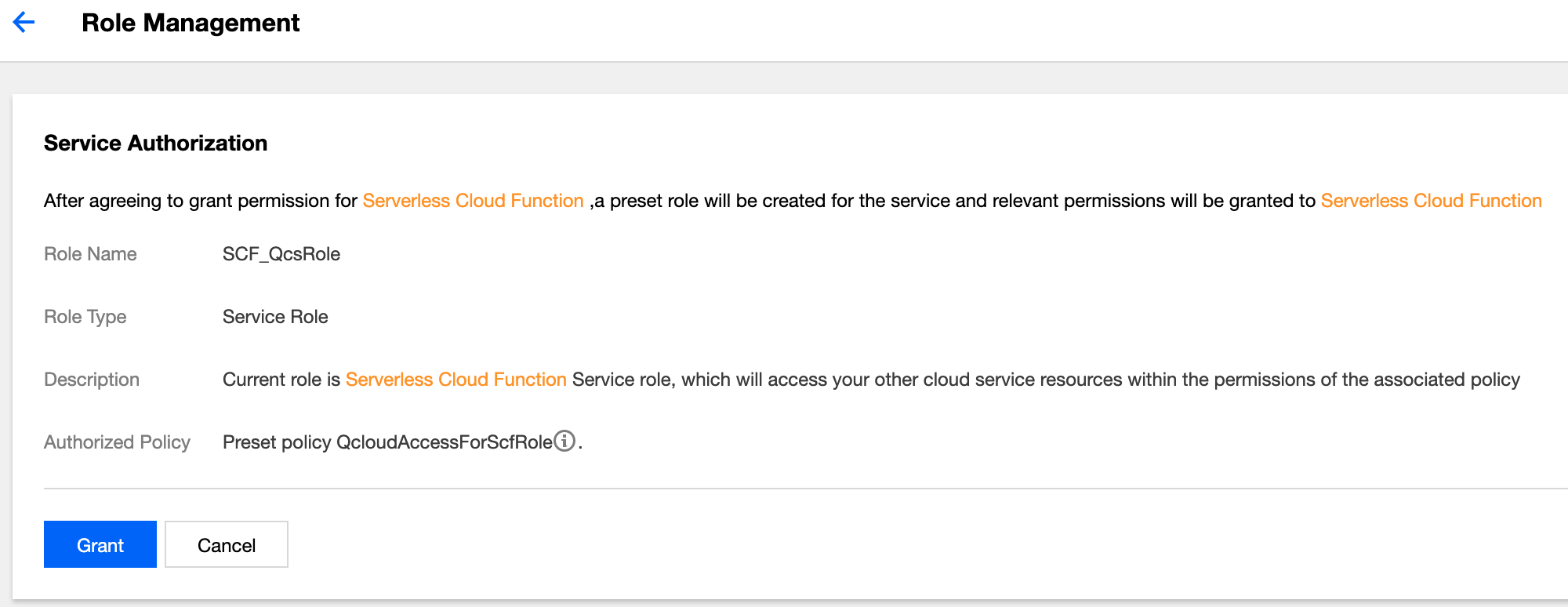 The SCF_QcsRole role is used to grant SCF the permissions to read and manipulate user resources during configuration. If you receive an error for missing role or permission when managing functions (such as using TCCLI or VS Code plugin to update function code), you need to configure the SCF_QcsRole role.
