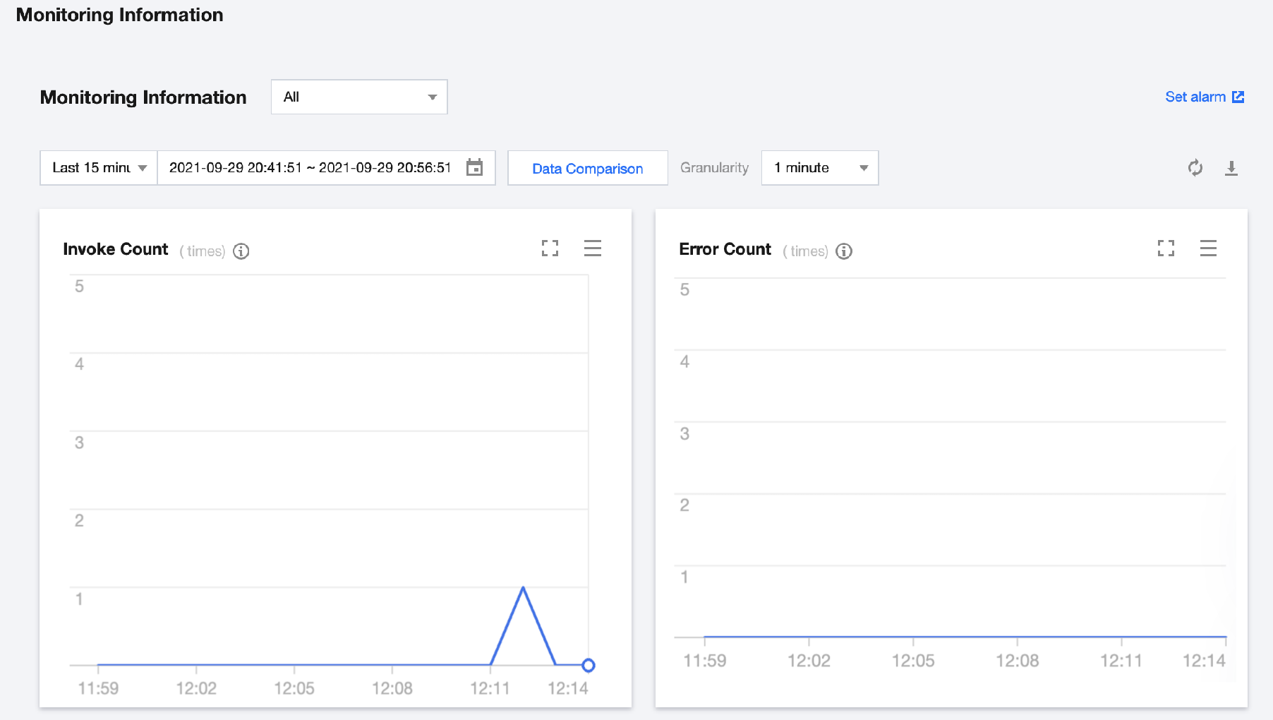 For more information on logs, see Viewing Execution Logs. On the Function Management page, select Monitoring information of the created function to view metrics such as function invocations and execution duration as shown below: