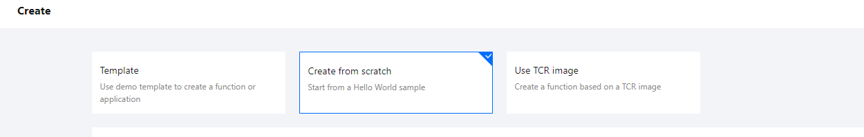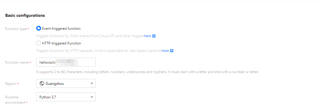 3. On the Create function page, select Create from scratch as shown below: 4. Configure the basic information of the function as shown below: