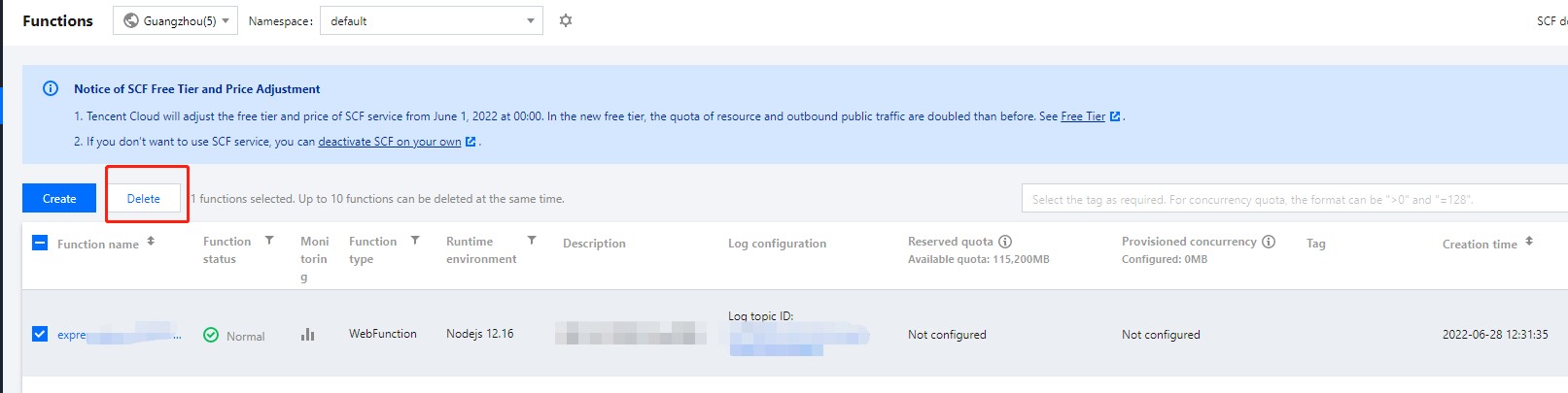 1. Select Functions on the left sidebar, select the function to be deleted, and click Delete as shown below: